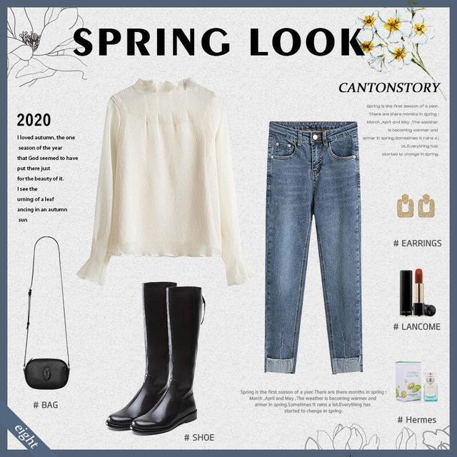 泡泡领的雪纺衫是比较有活泼有动力的单品服饰,面料的柔软感不仅仅有利于自身的皮肤,而且这种轻盈的体态也是具有美意的。搭配一条牛仔裤,嫣然一笑仿佛便要夺人心魂,这种女人是非常有特点的,她们往往白璧无瑕、秀外慧中,再搭配一条高筒马丁靴,其长度过膝即可,表现得她们往往爱自由,不愿被受到拘束。