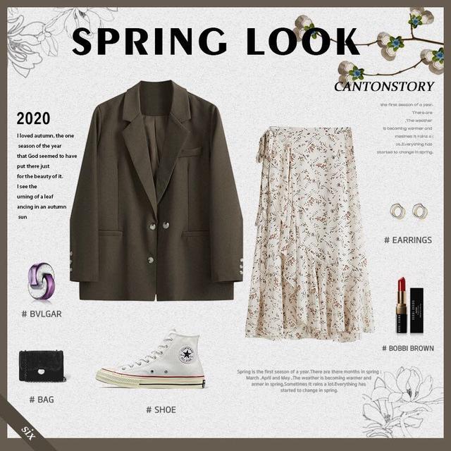 西装外套对于春季而言在厚度以及风格表现上都是十分合适,西装外套并不像以前一样只是职业女性的选择,更多的风格亦能够从西装外套上表现出来。裙装选择小碎花系列,既能够迎合春季带来的感觉,又能够强调个人品味。鞋面的设计看似简单,实则非常有动感,搭配一双帆布鞋,尽显活泼可爱。