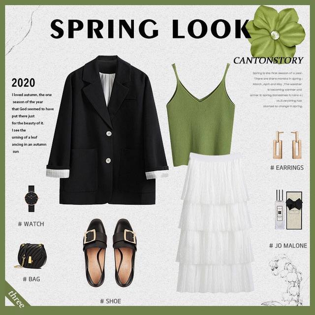 这样的穿搭显得个人明目清秀,也是一款人见人爱的穿搭,西装外套内搭一件纯色的吊带衫能够彰显自我气质,是非常年轻的装扮。裙装搭配纯白色蛋糕裙,此起彼伏且层次感强烈的设计让人看一眼就无法忘记。而且蛋糕裙也能够衬托一个人的清纯、动人,鞋子搭配一双小皮鞋,便是人间尤物。