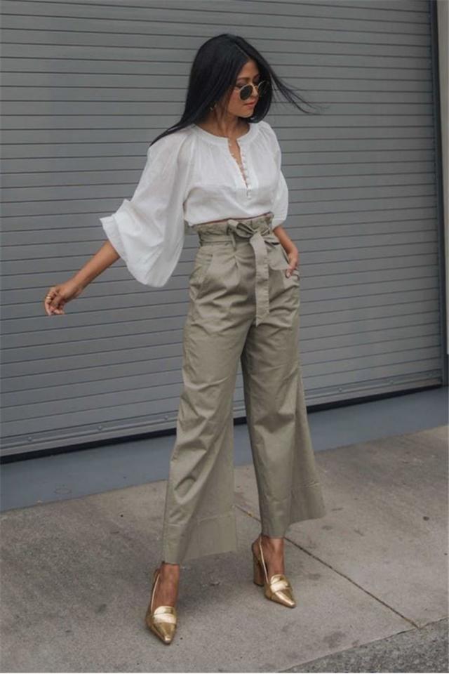 堪称阔腿裤升级版的”纸袋裤”现如今也是非常时髦的一件单品,高腰阔腿的设计保留了显瘦遮肉的作用,腰间的褶皱设计又增添了一份独特的精致优雅感,从细节上取胜,很适合大方优雅的成熟女性,搭配衬衣真的很有范儿!