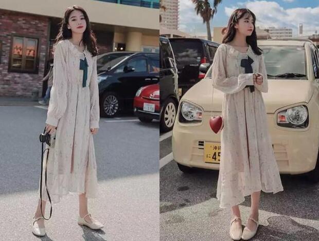 3、普通的裙子穿腻了,来一件有个性一点的碎花连衣裙吧,同样是雪纺的材质,在春天里穿上就足够的时髦显个性了,而且大部分女生一眼看见都会爱上的版型,衣领处还是可爱的娃娃领子,配上可爱的蝴蝶结实在是太有甜美女生的感觉了,宽松的版型穿上身慵懒风十足的。