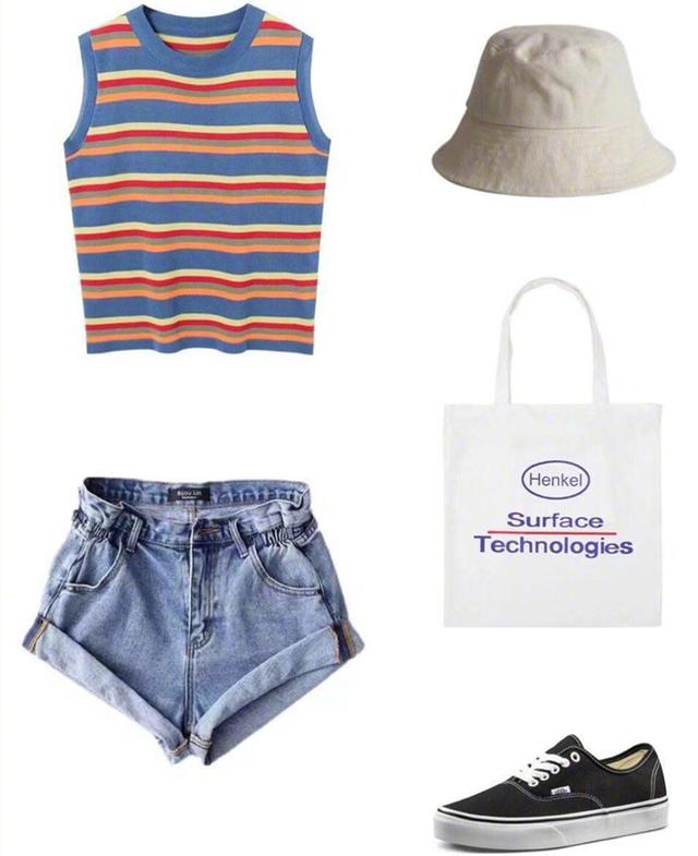 在这个泫雅风大热的今年,你怎么能没有一件彩虹小背心呢?手臂芊细身材姣好的妹子大可以在这个夏天选择一件彩色的小背心,穿衣技巧,小圆领的设计保守又不失风趣,修身的薄针织材质贴身穿着更显身材,搭配一条折边的牛仔热裤,长度到大腿根部,同时能微露腰间更加性感哦~在搭配上,我们尽量以休闲为主,一顶米色的遮阳帽和黑色的帆布鞋就能让你全身散发青春的气息。