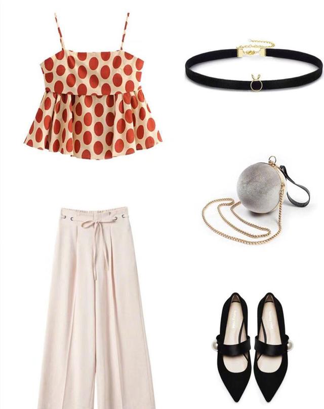 这套的搭配就比较青春小可爱了。对于年纪偏小的妹子来说,这个夏天可以选择一件红色的波点小背心,大红色的波点搭配上米白色的底色非常的可爱。再加上它的版型有点微阔,遮肉效果也是非常好的。在搭配上我们可以现在牛仔短裤或是宽松的米色阔腿裤都能穿出不一样的清新感。想要减龄,就选这套吧~