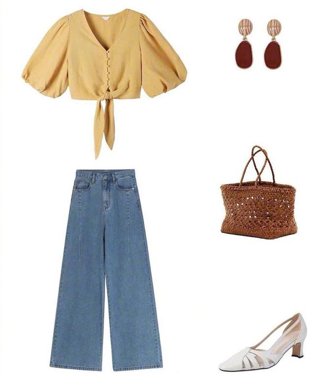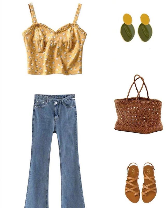 夏天对于上身偏瘦的妹子来说一定是她们最爱的季节。因为可以随意穿着各种可爱的小背心。这款亮黄色的小背心就特别适合夏天,显白又清新,白皮的妹子穿上能白上几个度,特别又活力。下身可以搭配一条牛仔喇叭裤,修身的版型让你的腿型看起来纤细又修长。不过这种修身的喇叭裤,小编建议梨形身材的妹子还是不要轻易的尝试,很容易显屁股大哦~在搭配上,我们可以选择一个竹编小包和一双便捷舒适的凉鞋,最好色系能和上衣有一个呼应之处。卷发的妹子搭配一个夸张的亮色系耳环会更加显眼哦~