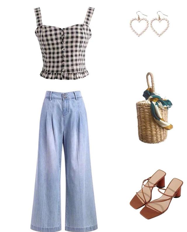 推荐大家一套比较韩系的穿搭,黑白的小背心搭配浅蓝色宽松牛仔裤可以说是很流行的一套搭配,既显身材又能展现出一种休闲感。随意搭配一双高跟凉拖,就可以和好友约着去郊游了~