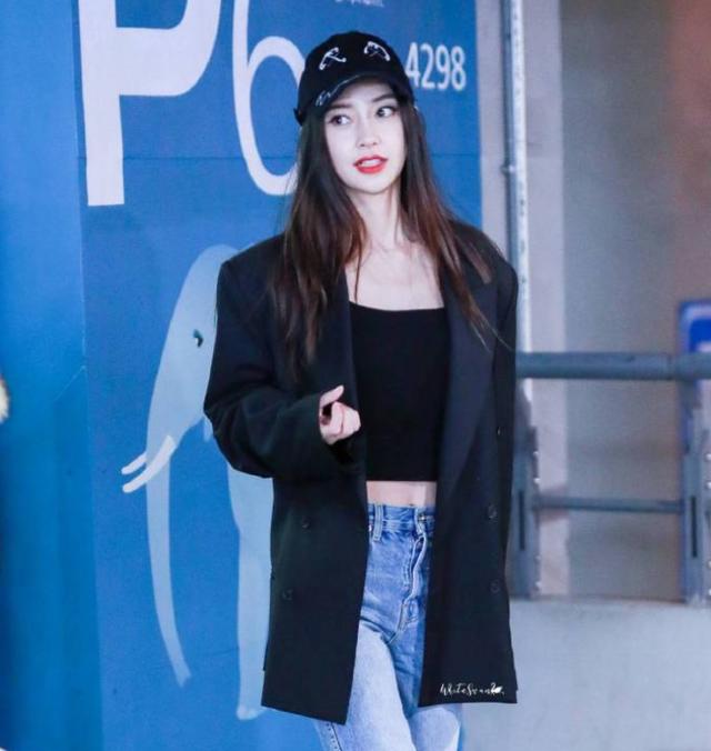 Baby这款西装的搭配我爱了,感觉她特别适合这种暗黑少女风,美艳又勾人。这款阔版西装很有男友风的feel,内搭黑色裹胸一边是锁骨一边是小蛮腰超级迷人。西装与牛仔裤也可以是说是王炸组合了,休闲与帅气兼具。