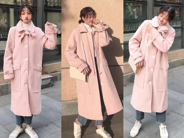 面对沉闷的冬天,想要穿得甜美风一些的话,不要再穿黑白灰了,不同颜色的大衣穿上才够好看,浅粉色设计的大衣,衣领处还有一个蝴蝶结作为装饰,整体比较直筒的版型,结合两个口袋彰显着简约美,整体造型看起来,同时具有时尚的活力感。2019年流行什么颜色大衣?