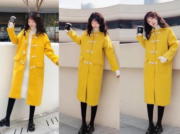 黄皮肤女生穿上也很显肤白的黄色大衣,很鲜艳的黄色,给人第一眼的感觉就是很显肤白,并且还很明显的颜色,结合牛角扣的设计,造型非常的干练,直筒的版型穿上遮肉更显瘦,过膝的长度无论走到哪都可以吸引人的视线。
