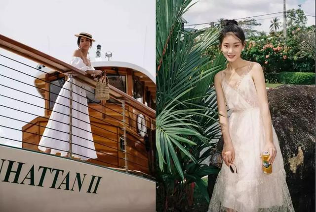 以前的欧洲贵族服饰就有着大裙摆的特征,在舞会上跳舞旋转起来真的很能成为焦点。在古代贵妇人的服饰变更史中,大裙摆的服饰也占了很大一部分,雍容华贵。今年最火的桔梗裙也颇有复古格调,比如这条白色大裙摆一字肩裙,是站在游轮上的富家小姐的既视感,搭配礼貌和手拎包,贵气满满。另外一套桔梗裙,风格还是偏少女和舒雅的气质,白色蕾丝和吊带裙的结合,和夏天超级配。
