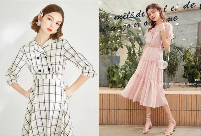 桔梗裙的大裙摆和高腰,对于梨型身材的人来说还是很适合的,能够帮助突出纤瘦的上半身,而臀部和大腿部分的脂肪堆积能够完美隐形。这条格纹双排扣桔梗裙端庄又大方,作为职场穿搭真的很不错了。如果想要出去逛街,穿得更加减龄轻松一点,这套粉红色纱裙也很符合要求,木耳边的袖子能够遮住肉肉的手臂,而蛋糕裙的元素很有少女浪漫的气息。