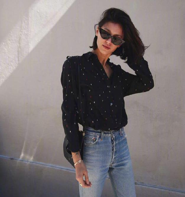 在不是很冷的,在不是很冷的时候也是可以不用选择外套的,这次的小姐姐就选择了一件衬衣来搭配黑色衬衣上,设计了不同颜色的斑点,让造型看上去可以更时尚多元,而下面的是选择了一条蓝色牛仔裤,上衣的衣摆直接放进裤子里面,而且高腰的牛仔裤也可以让腰线位置更提高几分。