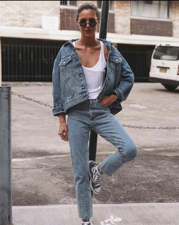 牛仔肯定是很多小仙女都比较喜欢的单品了,尤其是搭配一身的牛仔,更可以给我们带来很意外的效果了,这次的小姐姐选择了一身水洗白的牛仔套装,相对来说牛仔褂的设计是相对比较简单的,不过外套选择大一码的款式,让造型更有几分的男友风,不过在外套的里面则是直接搭配了一款白色的吊带背心,澳洲时尚博主Petra穿衣搭配图片吊带背心可以更好地体现她的身材,中和牛仔外套带给我买比较强硬的感觉,而下面则是选择了一双黑色的帆布鞋,让造型看上去更减龄很多。