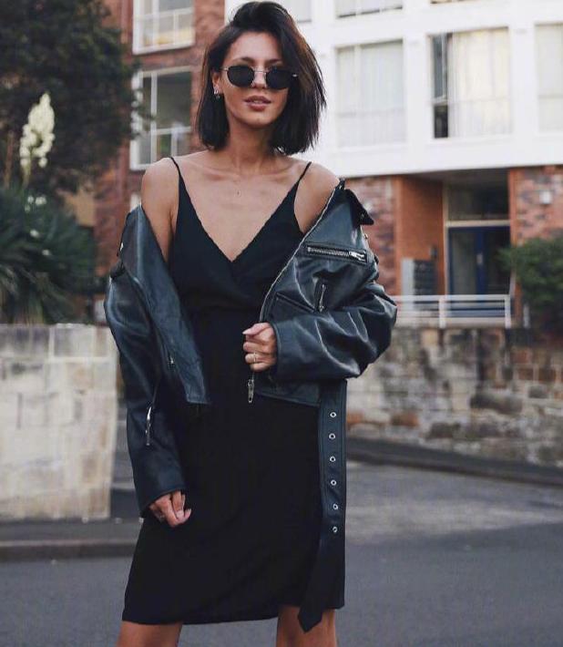 如果说选择秋季里面的外套的话,皮衣就是很常见的一种单品了,不仅可以起到很好的保暖效果,皮衣的隔风效果也是很不错的,这次来小姐姐就选择了一件皮衣作为外套,不过这件皮衣的设计是相对比较个性的,在衣服的下面设计了腰带的造型,不过腰带只是挂在衣服上,让造型更具有灵动感,而在外套的里面则是选择了一款黑色的吊带裙,裙子可以给我们带来更多的女人味儿,很好的中和了皮衣带给我们的中性效果。