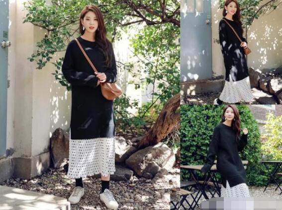 拼接色的裙子在一年四季当中都是很潮的一种元素,这款是上下材质不一样的拼接裙子,上面是黑色的针织材质,本身上身就会很显瘦的了,下半身拼接的波点的元素比纯色系更容易体现内涵的,长度上是比较显修长的长裙设计,撞色的波点效果,简单又柔和的色彩搭配。整体不失适度的优雅和极简的气质感,脚上搭配一双小白鞋就很美,怎么穿都不会出错。