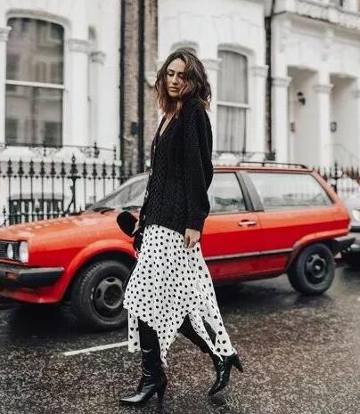波点不规则的流苏长裙搭配黑色长筒靴,上衣选择黑色毛衣开衫,自然的垂顺下来,优雅个性,不过这种穿搭比较挑身材,适合又高又瘦的女生。