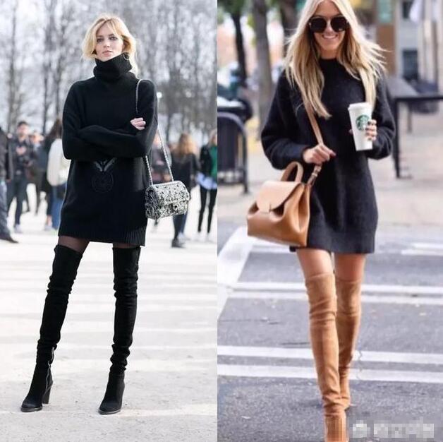 长筒靴搭配中长款毛衣,时尚圈流行搭配,简单又时髦,更重要是超显腿长。黑色中长款毛衣裙搭配黑色高筒靴,高级时髦。搭配屋。