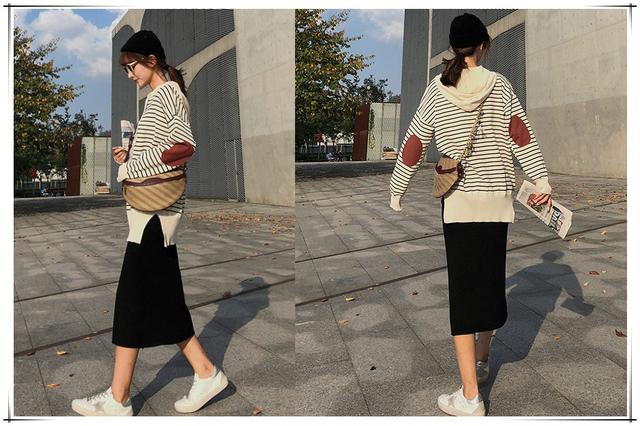 搭配上包臀裙很显得有女性的滋味,宽松的条纹给人很显得慵懒的觉得,包臀裙上窄下宽的廓形,很好显瘦你的身体,高腰的设计,很好提升你的腰线,拉长你的身高比例。