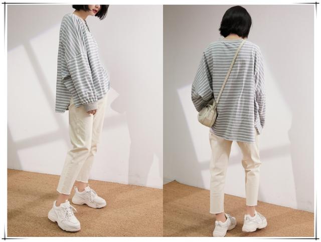 休闲的日常穿搭中出境单品最多的一款,宽松还很温馨,搭配上条纹的上衣,视觉上个人很显瘦,愈加显得腿部的细长,还自带清爽和复古的觉得,条纹上衣和灰色裤子搭配,很显得调和。
