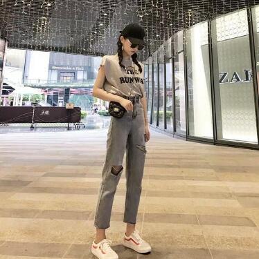 有的背心是短袖的风格,宽大的带子简直就是短袖将袖子减掉的样子。原本中规中矩的短袖,变成一件背心的模样,反而更加的别具一格,风格大大改变了,有点难街头风的感觉。下身搭一条破洞牛仔裤,没有那种传统的牛仔裤一样没有属于自己的亮点。简单的小心机破洞就可以提高整套搭配的气质。对于破洞牛仔裤我们上面还可以搭一件系带的吊带背心,这样会显得身材又瘦又高,完美比例哦。