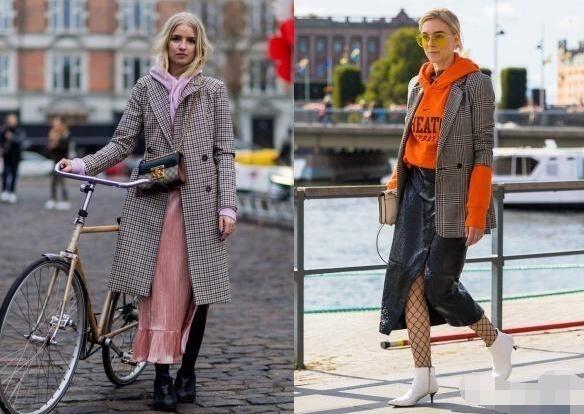 今年很流行大衣内搭连帽卫衣这种叠穿法,休闲中透着时髦,卫衣的衣领蛮高的,有很好的防风保暖的效果,代替毛衣作为内搭其实也挺不错的,而且大部分大衣都没有帽子,风大的时候连帽卫衣就发挥了它的作用,可以为我们遮风挡雨,女生冬天时髦保暖搭配实用又好看。但是脖子短粗和上半身肥胖的妹子我不建议你学习这种叠穿,因为连帽卫衣的领口比较小,帽子也有点小,配上有衣领的外套,容易让帽子耸起来,显脖子短,不够你可以尝试内搭无帽卫衣,更加适合你,穿在身上更有格调,更修饰身材一点,让你兼顾温度和风度。