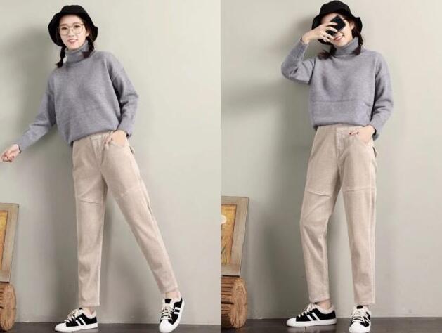 休闲裤一直都是很受群众的欢迎,穿上它舒服自在,女装搭配,这款休闲裤是灯芯绒材质的,穿上显高级感,高腰设计,橡皮筋腰带,方便随性,前面斜口袋设计,后面也有两个大口袋时尚又美观,搭配一双拼色平底鞋非常显高显瘦,还很时髦!