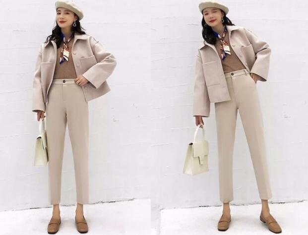 米白色毛的休闲裤是今年非常流行的元素,它百搭又不沉闷,很多妹子都喜欢穿,偏胖的妹子也不用担忧,休闲裤萝卜裤型可以包容各种身材,遮肉显瘦,搭配一双棕色乐福鞋,平底的设计使脚踏得舒服自在,好看又时髦!