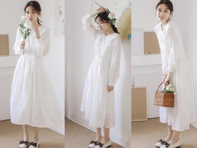 很浪漫的法式连衣裙,很不挑肤色的白色,衬托出你很白皙的肌肤,雪纺的面料,穿上身超级清凉感的,可爱的娃娃领,俏皮又甜美感,A字的版型,凸显你很美的身材比例,系上腰带,更显腰细,过膝的长度,轻松显瘦,搭配蝴蝶结的奶奶鞋,复古又时髦。