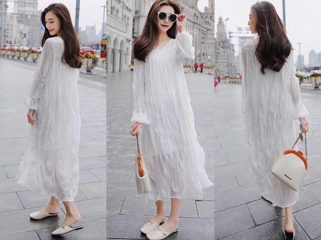 很小众的法式连衣裙,超级浪漫的,白色的色调,适合各种肤色的女生,超显白的,过膝的长度,把你双腿胖的缺点都遮掩了,视觉上比较显瘦的,褶皱的纹理设计,给裙子增加亮点,喇叭的袖口,更显精致感,搭配奶奶拖鞋随性又好看。