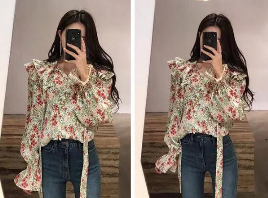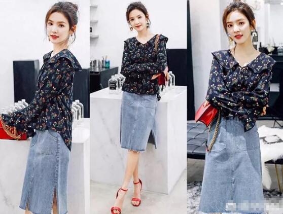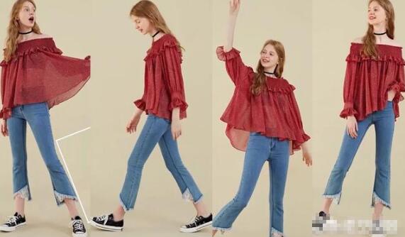 红色的娃娃衫,可当一字肩穿,碎花衣服怎么搭配好看搭配九分牛仔裤,上繁下简的搭配方式,对于特别瘦,尤其是平胸的妹子最适合这么穿,紧身的九分牛仔裤尽显腿长,上衣宽松的碎花衫注意力分散,扬长避短才是穿搭的精髓。