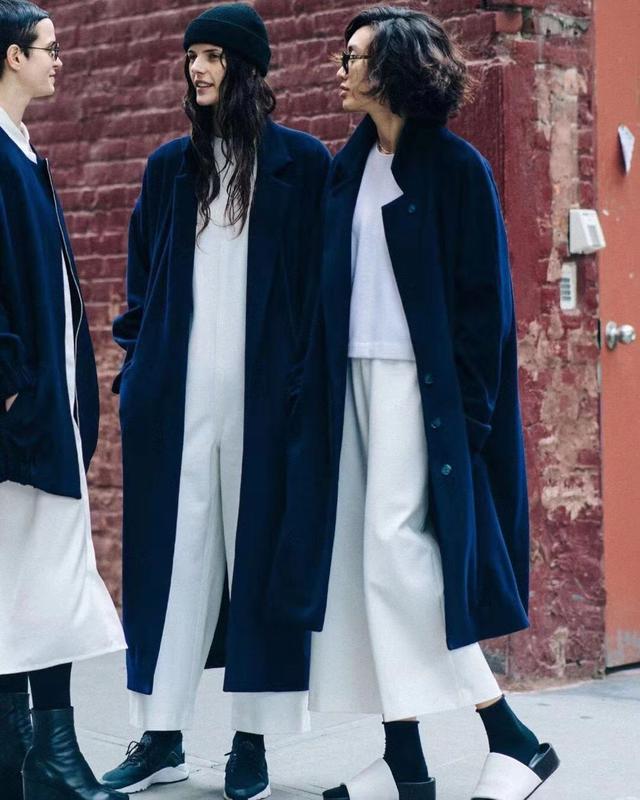 内搭选择同一颜色的色彩搭配也不错,藏青色的大衣非常的显年轻。同时,这也是一款经典优雅的颜色,看起来一点也不老气。阔腿裤和打底衫都是白色的,干净整洁非常的有时尚感,大衣色彩比较暗一点,有一种特有的色彩对比体现,给人一种轻快愉悦的感觉。