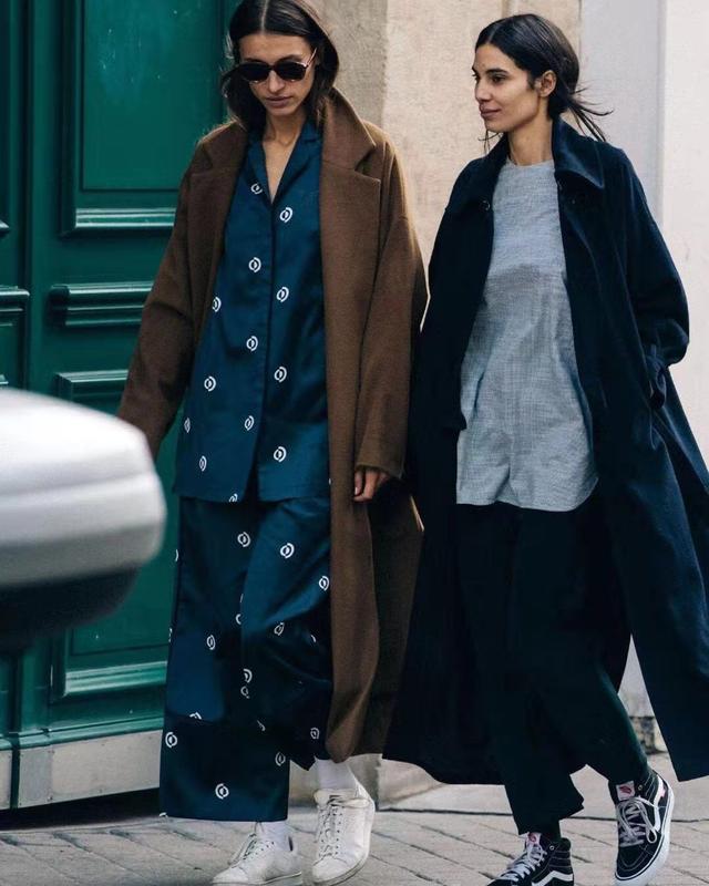 迷人的步姿,给人的感觉非常的随性,大方。大衣里面穿一套类似睡衣的套装,面料舒适,非常自然,看似慵懒随意,实际上是很有时尚的一款穿搭。不同风格的单品混搭,时尚的层次又有了新一步的跨越,整个造型看起来是不是非常的时尚和潮流呢!
