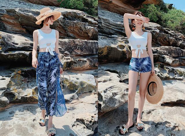 海边度假,最佳选择就是三件套。这套印花下装的套装,就很适合海边穿着。上身白色露脐款背心,腰间镂空系带,性感清新。下身深蓝色印花,机具度假风情。外面穿一条雪纺长裤,不仅飘逸,还能防晒,超级nice。