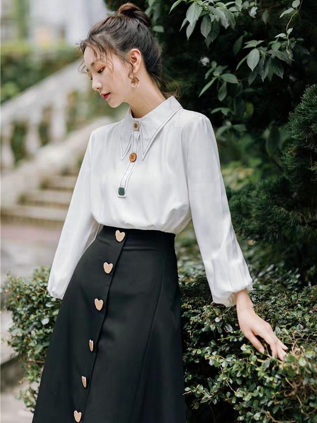 白色衬衣和黑色半裙的搭配真的超级减龄,穿上之后就有一种非常学生气的感觉。衬衣是一件纯色宽松的polo领衬衫,它的领子设计的非常巧妙,采用的是非常有个性的大尖领,前面还有假门襟,看起来时尚感非常足。