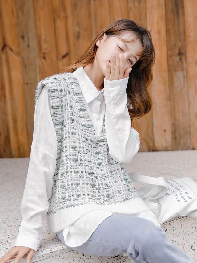 这件马甲是一件覆盖着格纹的针织马甲,颜色非常好看,各种色彩元素看起来比较杂乱,但是却让人看一眼就挪不开眼睛。绿色的马甲搭配白色的衬衫会给人一种比较强烈的色彩碰撞,提高了衣服的质感。