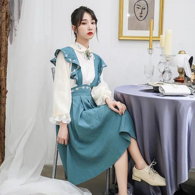 这条裙子是一条蓝色复古吊带长裙,版型是那种超级经典的优雅版型,所以看起来也会有那么一些些的时髦感在里面,毕竟经典的款式是永远也不会过时的。在两条背带上都有非常好看的荷叶边的装饰,不会特别夸张,反而有一种十分精致的感觉。
