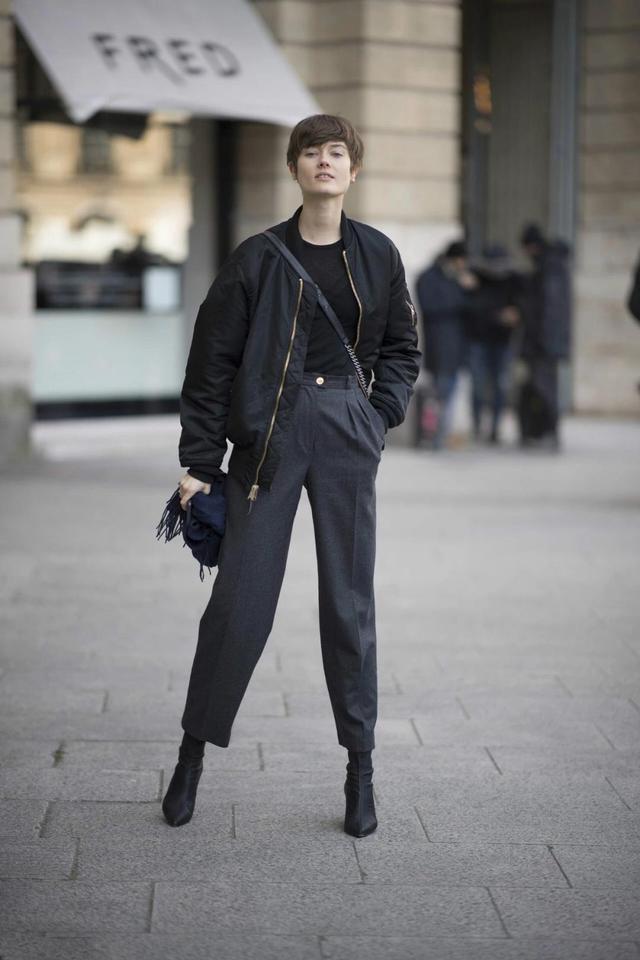 对于小个子的仙女,用短大衣搭配烟管裤更加合适。例如选择一件同为中性风的飞行员夹克,搭配上线条分明、裁剪利落的烟管裤,整体上给人桀骜不羁、潇洒随性的感觉,简直是一个酷炫的嘻哈少女。还担心不够高的仙女,再穿上一双高跟的袜靴,立刻就能给人腰以下都是腿的既视感。