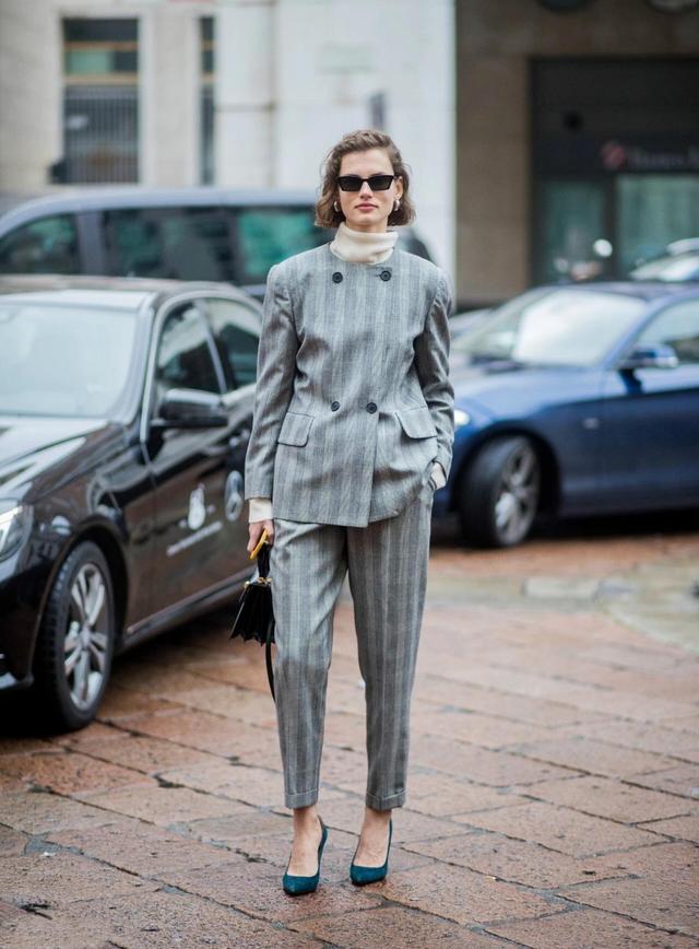 除此之外,还可以尝试西服和烟管裤搭配出的西服套装,不仅搭配上不用费脑筋,而且很有整体感和复古感。特别是引入格纹和条纹设计的西服套装,不仅打破了西服原本的严肃呆板,给整体造型增加了更多的亮点,而且分分钟就能给人霸道女总裁的帅气飒爽感,任何身材的仙女都能轻松驾驭。