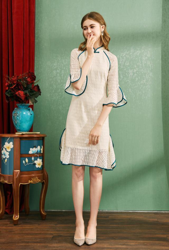 敢于打破传统的“形制”,彰显现代女子的个性与时尚,也是改良旗袍风靡娱乐圈的原因,淡淡的杏色温润恬静,将少女的清纯又秀美完美展现,甜美的蕾丝放大了少女的柔情与婉约,领肩和袖子朦胧透肉的设计,性感又娇俏,袖口和下摆两侧的花边甜美大方,恰到好处的裙长,举手投足风情迷人。