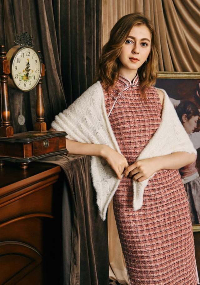 也有部分女生偏爱旗袍,是因为旗袍氤氲出来的怀旧情愫,是一种情节,暗红色的格子文艺又知性,一派民国学生的唯美风情,旗袍修身曼妙,将女生衬托得玲珑娇俏,精美的白色花边沿着领襟装饰,恬静浪漫,下摆开叉含蓄又高级,不动声色的演绎着记忆中的某个故事。