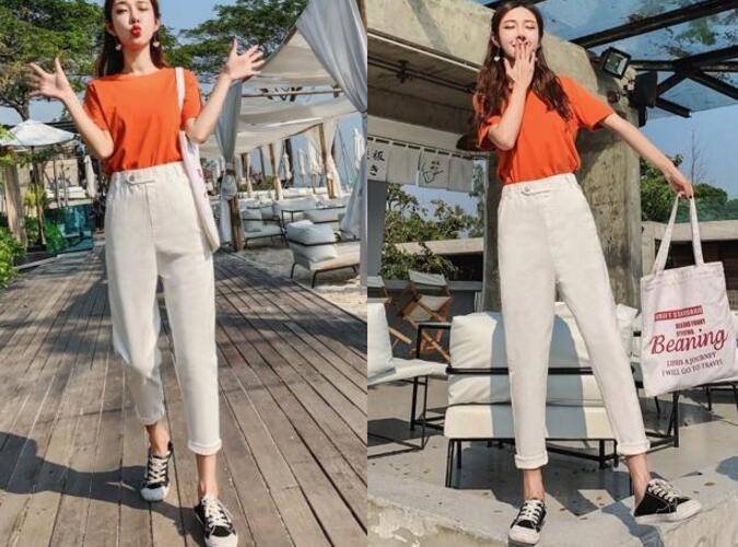 这款是属于米白色设计的九分休闲裤,裤口是可以轻松驾驭的版型,而且米白色超级百搭显气质的,它比白色还有沉色系一些,搭配橙色t恤,橙色超显肤白的,而且完全不需要考虑肤色的问题,穿上就很显白了,整体搭配起来突显小清新的清爽感。