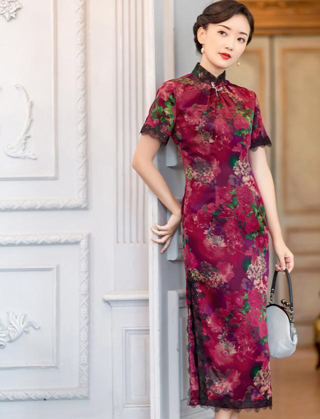 同样是香云纱印花旗袍,一样的色调,不一样的印花,却晕染出别样的古朴韵致,清浅的痕迹,影影绰绰,幽怨的情愫在心底缠绕,总有一些朦胧的印象,透着几许神秘与凄凉,旗袍传统的全开襟设计,更添古典韵味,精美的花扣沿着斜襟依次点缀,俏丽安然,旗袍开叉风情万种,灵动而曼妙。