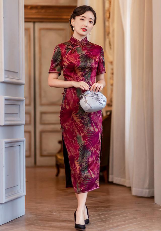 香云纱的旗袍自由一种风骨,演绎着浑然天成的风致,一种内敛的惊艳,妩媚深情的印花镌刻着持久的韵致与暧昧感,隐含的奢华,明净的优雅,静谧的吸引,旗袍勾勒出优美的腰身曲线,典雅的立领点缀一颗精美的蝴蝶胸针,雅致高级,拉褶的设计时髦又娇俏,举手投足风情婉约,气韵悠远。