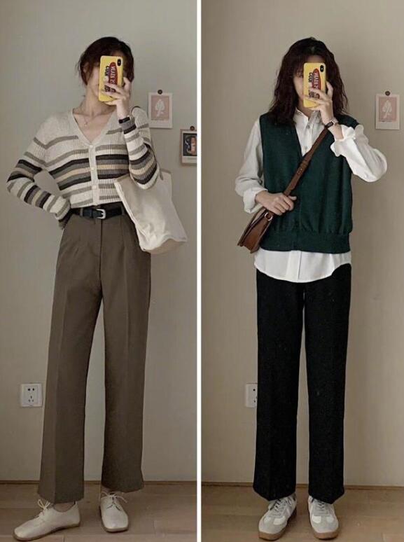 针织衫可以甜美,可以慵懒,也可以知性优雅。条纹的针织衫,更加时尚大方。搭配直筒裤,有一种精致利落的美感。这样穿搭,也是非常甜美减龄的。而如果想要更加个性时尚一些,可以选择针织马甲的穿搭,搭配白色衬衣,层次分明更加精致高级。