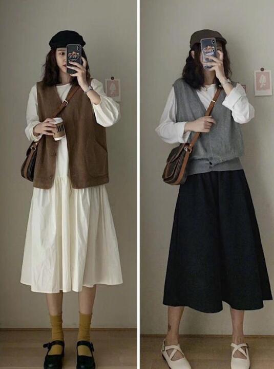 如果是非常喜欢裙装的姑娘,肯定不是这么早早地就脱下裙装。尤其是一些面料比较厚实的连衣裙,当风险也是比较强的。初秋的季节,随便搭配一件针织马甲,不仅层次更加明朗,也更加优雅时尚。除了连衣裙以外,针织衫搭配T恤,也是不错的穿搭。