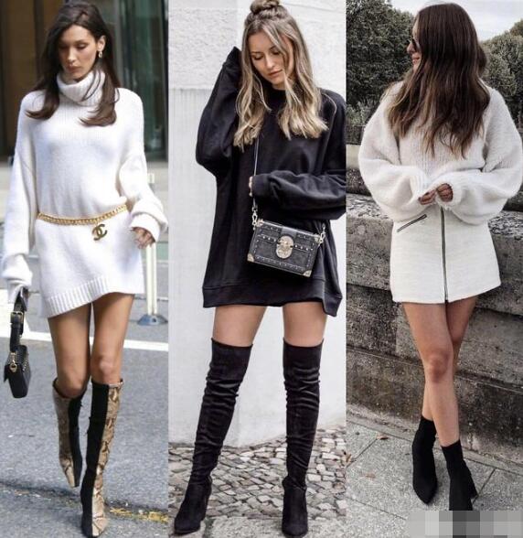 下衣失踪是非常显腿长的,虽然这种穿法在北方的秋冬并不适用,但是南方的小伙伴还是可以尝试的哦,针织短裙或者卫衣裙都可以,搭配长靴,分分钟穿出大长腿的效果。