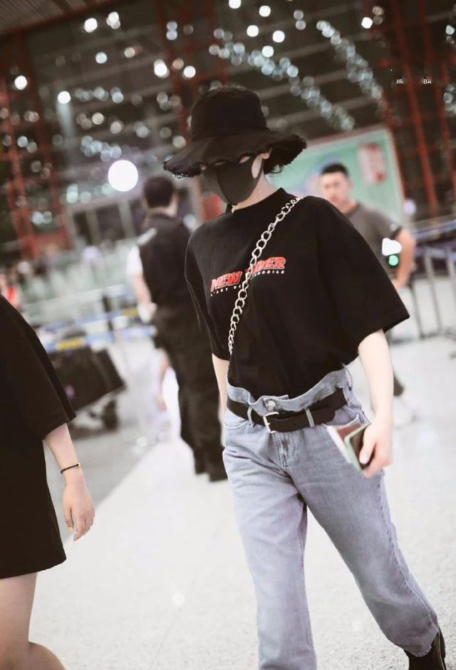 超级显瘦的黑色T恤,也是迪丽热巴的机场单品之一,玩转中性风穿搭妥妥的。宽松的黑色T恤,搭配上同样宽松的黑色牛仔裤。从皮带到背包单品,也都是宽大的设计。▼