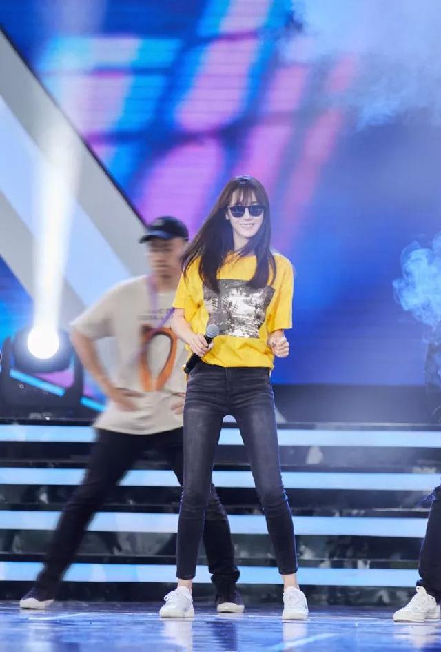 黄色的T恤搭配的是一条黑色的牛仔裤,不过是紧身的版型,迪丽热巴还将上衣扎进裤子里,完全暴露自己的腿型。这种修身的小脚牛仔裤,梨型身材的女生穿起来会非常显胖。
