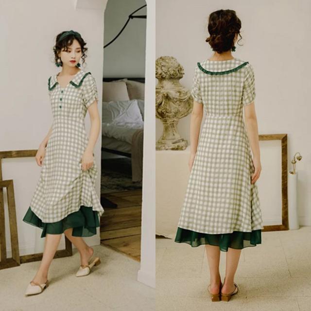 经典又好看的格子连衣裙,穿起来有种怀旧又复古的感觉,搭配V领+娃娃领的结合,更时尚更好看了,淡淡绿色,清新怡人,唯美感十足,收腰的设计,今年流行的连衣裙有哪些款式?凸显身材,夏天脚踏平底鞋就很美了。