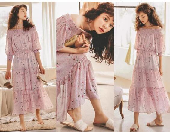 4、淡淡紫色的碎花连衣裙,上身足够让你显气质又很美的了,配上一字肩的领口,散发出性感又妖艳的一面,超女人,并且一字肩是松紧的效果,摆脱了掉落的尴尬感,满满的小设计心机,小碎花的装饰,是不是就像是小仙女一样展现在你的面前,超级地美,袖子是七分收紧袖的设计,遮肉显瘦更好看,蛋糕式的裙摆,不挑身材,时髦又个性,如果你也喜欢的话,赶紧入手一条吧,让你美足一整个夏天。