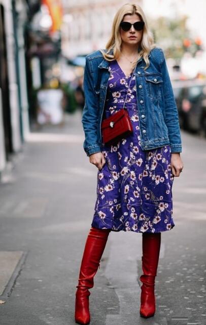 热情四射的红色,是无人能抵抗得住它的魅力,让人眼前一亮。这是6款搭配中小编最喜欢的一款,让你逆龄成18岁的少女!当紫色印花裙,遇上红色靴子,高挑又气质,潇洒中带有一丝靓丽,靴子配什么衣服好看?打造率性优雅范。外搭牛仔外套,干练又不失甜美气质哦!